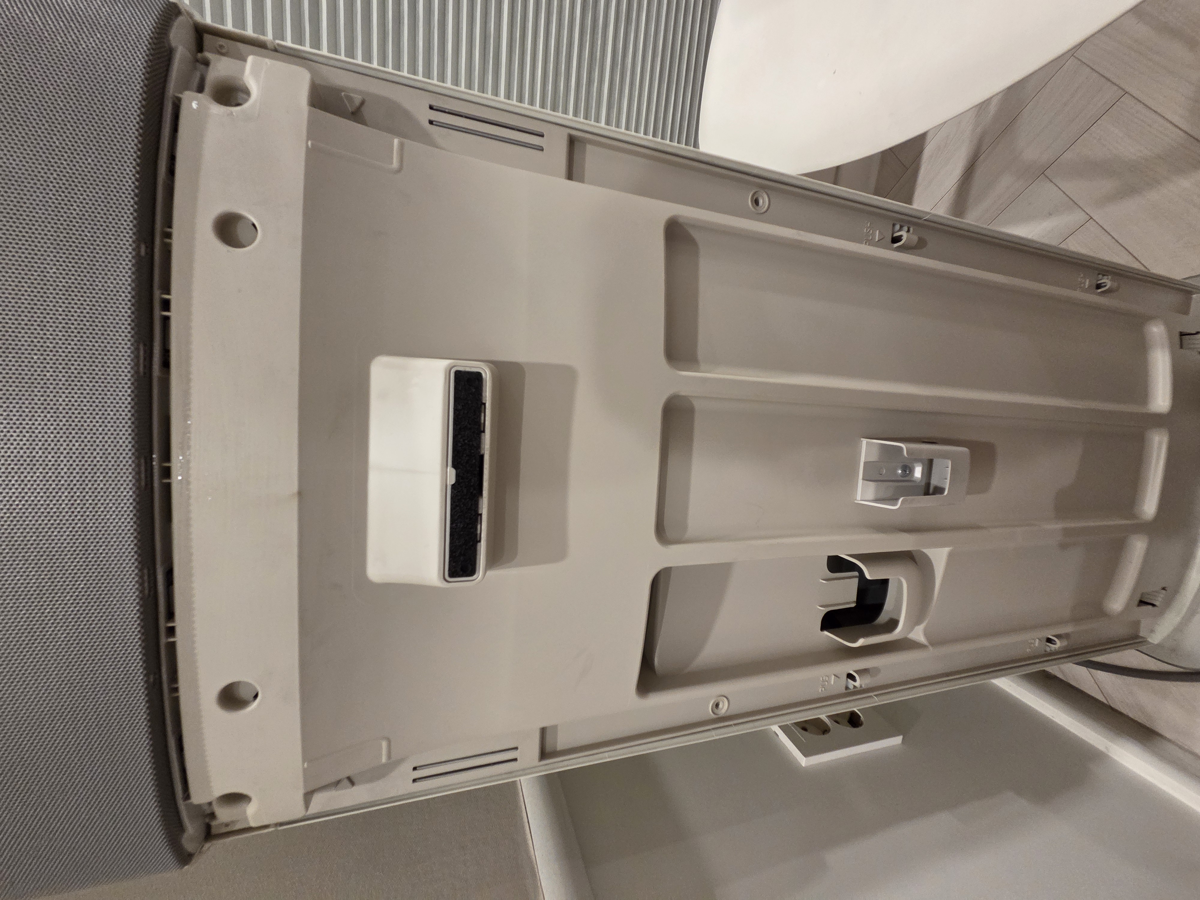 - 스탠드형 기준, 뒷면에서 필터를 꺼냅니다. 총 2개의 필터가 있으며, 진공청소기로 먼지를 털고 중성세제를 푼 물에 10분 정도 담가둔 후 부드러운 칫솔로 문질러 세척합니다.
